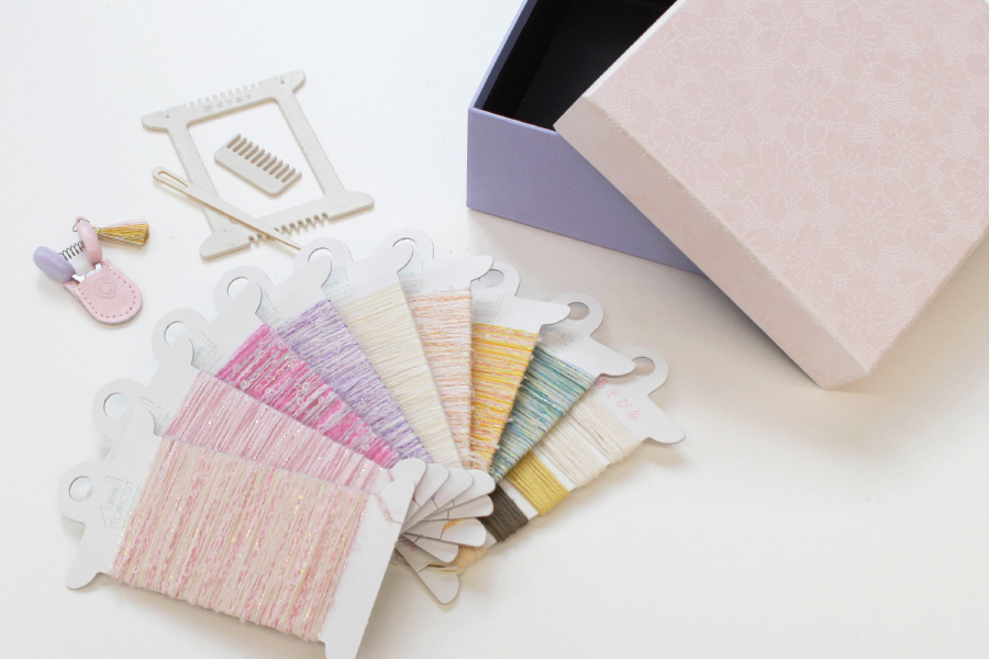 8種の春色糸とポケおりを、さくら色の和紙の小箱に収めました 。